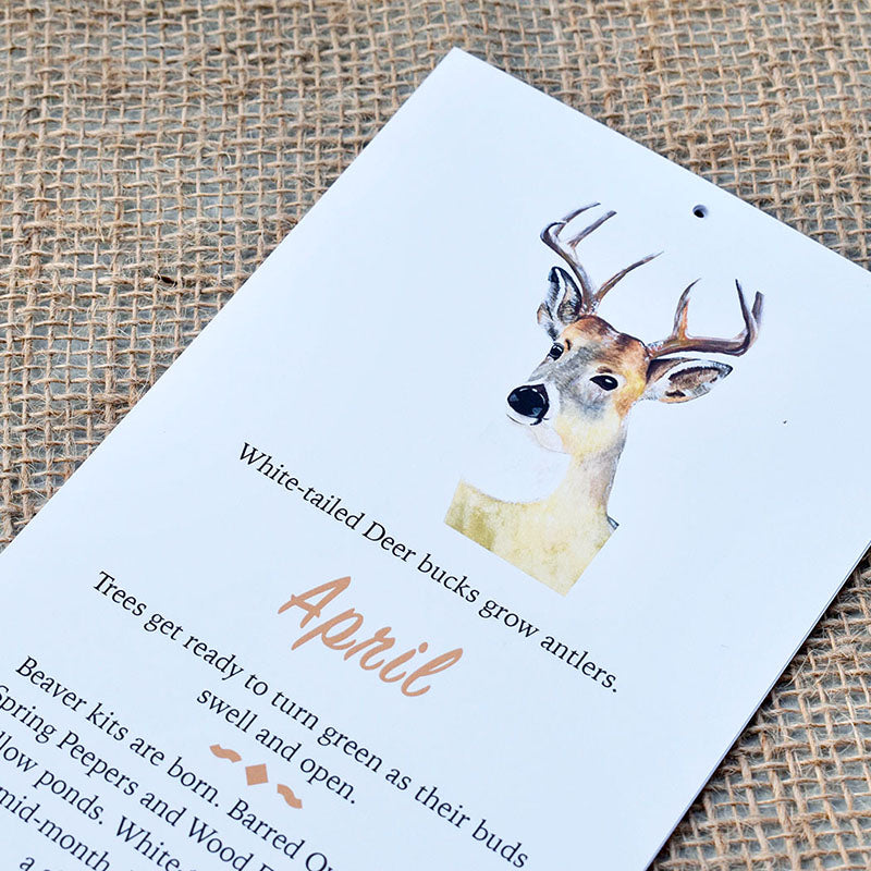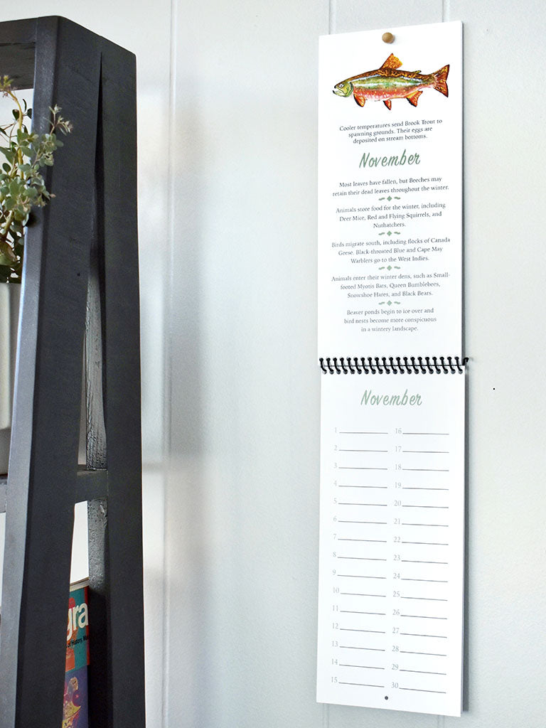 Paintings include: Great-horned Owl, Red Fox, Mourning Cloak Butterfly, White-tailed Deer, Chickadee, Tiger Swallowtail Butterfly, Loon, Yellow Warbler, Mushrooms, Sugar Maple Leaf, Brook Trout, and a Spruce Grouse.
