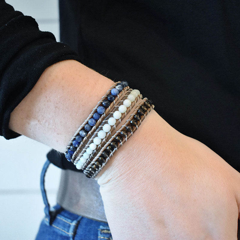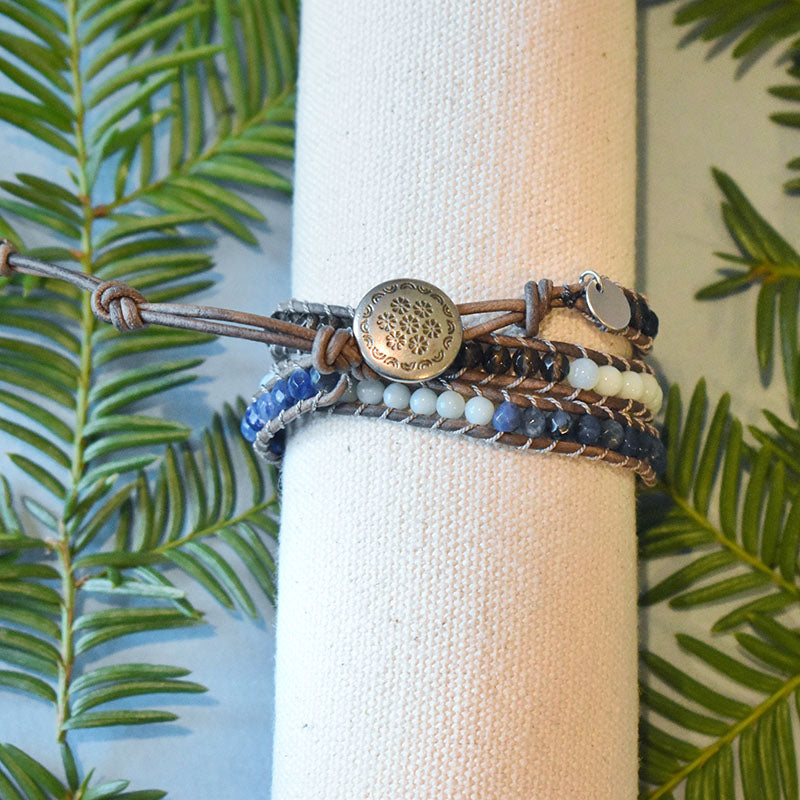 Statement wrap bracelet featuring three gemstones: Sodalite, Amazonite, and Smoky Quartz. Sodalite is the gemstone of emotional balance & self-trust. Amazonite is the gemstone that encourages good luck & fortune. Smoky Quartz is the gemstone that lifts fear and depression to bring emotional calmness.