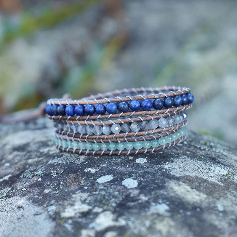 Statement wrap bracelet featuring three gemstones: Labradorite, Aventurine, and Lapis. Labradorite is the gemstone of transformation. Aventurine is the gemstone of prosperity, compassion and empathy. Lapis is the gemstone that encourages self-awareness by opening your mind.