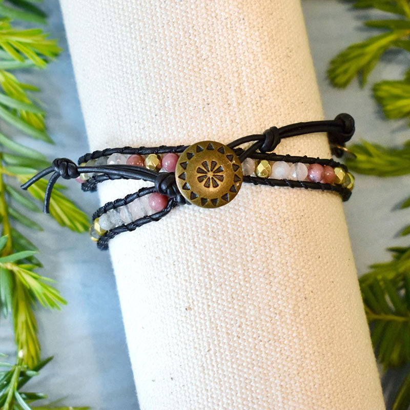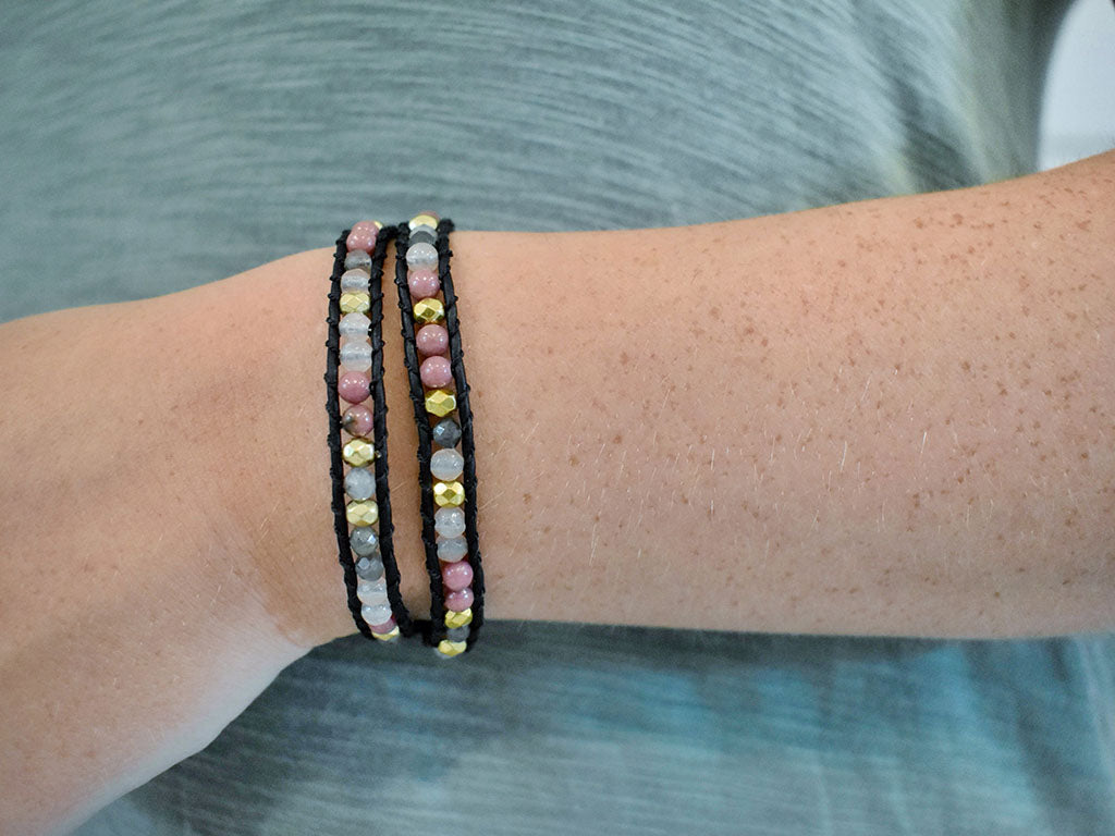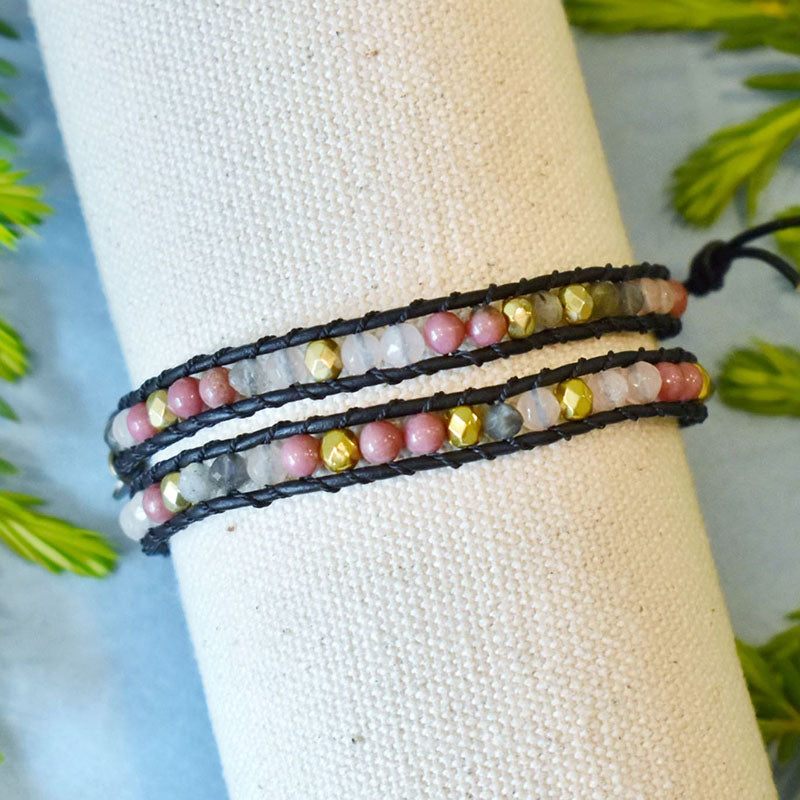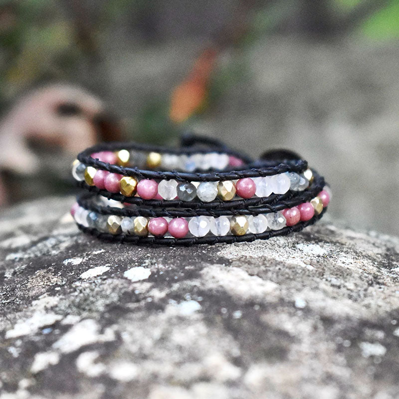 Wrap bracelet featuring three gemstones: Labradorite, Rhodonite, and Jade. Labradorite is the gemstone of transformation. Rhodonite is the gemstone of compassion. Jade is the gemstone of longevity & wisdom.