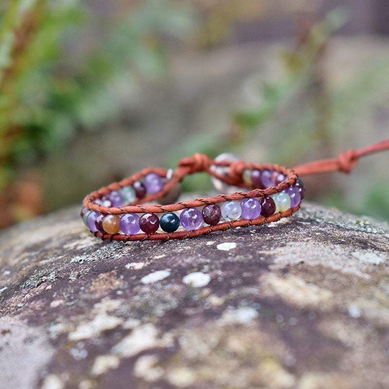 A wrap with three gemstones, that together, represent wholeness. Amethyst promotes calmness, Garnet brings revitalization, and Fancy Jasper is the stone of healing.